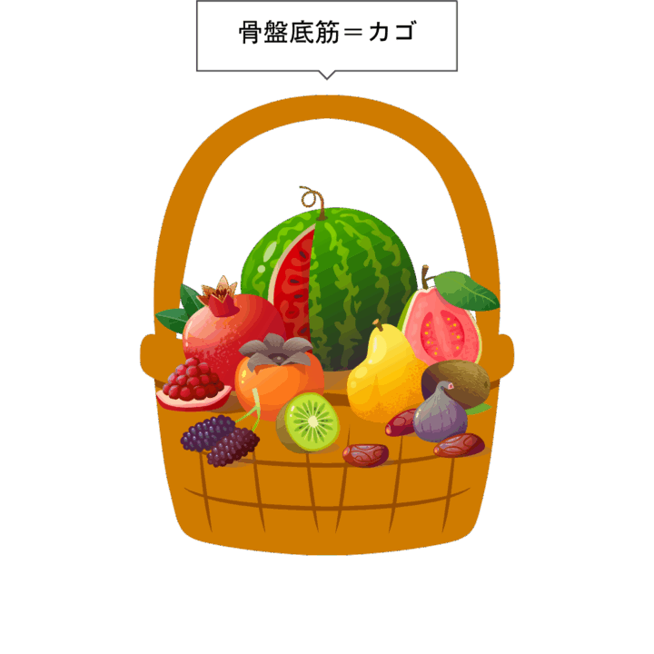 果物が沢山はいったカゴをイメージしてください。カゴの底部分が骨盤底筋です。カゴのなかにリンゴ、バナナ、梨、メロン、スイカ・・・などたくさん入れて運ぶと想定します。カゴが新しいうちは沢山入れてもたわむことなく比較的しっかりしていますが、何度も使っているうちにハリがなくなり伸びてたわみます。だんだん中の果物も中心に集まって形が崩れやすくなります。それが骨盤底筋が緩んだ状態です。